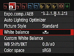 As you'd expect, the Canon 60D offers a full range of White Balance settings, including an Auto setting, six presets, and a Custom setting. The six presets include Daylight (5,200K), Shade (7,000K), Cloudy (6,000K), Tungsten (3,200K), White Fluorescent (4,000K), and Flash (6,000K). The Custom setting bases color balance on a previous exposure, meaning you can snap an image of a white card and then base the color temperature on that image. There's also a direct Kelvin color temperature setting, which can be set within 100K steps, from 2,500 to 10,000K.