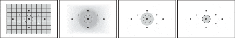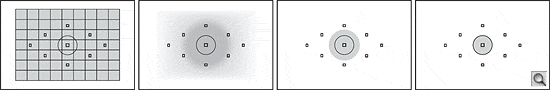 Here you can see the coverage of the 60D's four metering modes, accompanied by the positions of the nine autofocus points. From left to right: 63-zone Evaluative, Center-weighted Average, 6.5% Partial, and 2.8% Spot metering.