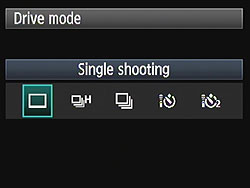 The camera's Drive setting also accesses two Self-Timer modes, which open the shutter 10 or 2 seconds after the Shutter button is pressed, giving you time to dash around in front of the camera. Either Self-Timer mode can also be used with an optional RC-6, RC-5, or RC-1 infra-red remote control unit, allowing an image to be captured immediately or with a two-second delay after pressing the remote's shutter release button.