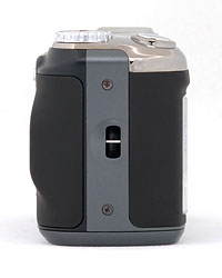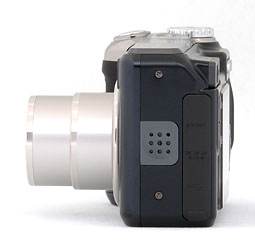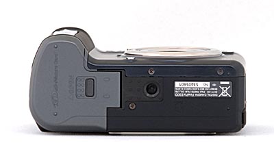 The right, or grip side of the camera has a recessed lug for the wrist strap. On the camera's left side you'll find the camera's speaker and connection ports. These include composite video socket, USB connector, and plug for an optional AC adapter. All are protected by a rubber cover attached to the camera by a thin tab.