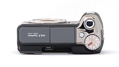 The top view of the Fujifilm FinePix E900 reveals the large silver trigger button, small mode dial and the power button. The mode dial is just large enough to be worked easily by photographers with large fingers, and the power button is small and recessed enough that your trigger finger is unlikely to mistake it for the shutter release while you have your eye at the optical viewfinder. Not readily apparent is the pop-up flash, which sits hidden in the top-middle of the camera. This pops straight up when you press the flash release, and it's placed where it's not likely to be in the way or accidently covered with your fingers while you're holding the camera.