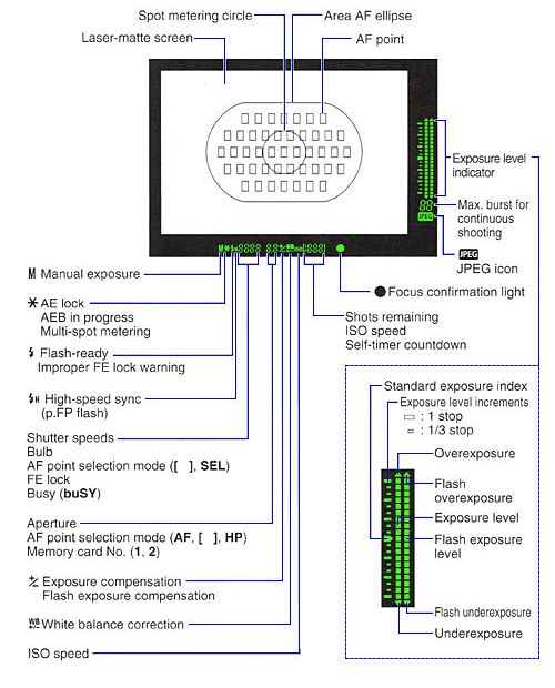 The amount of information conveyed by the 1Ds Mark II's viewfinder readout is quite impressive, all the more so because the display is actually quite uncluttered and easy to understand. The illustration below (courtesy Canon USA) shows all the internal viewfinder displays and their functions. (Readers familiar with the EOS-1v film SLR or the previous EOS-1Ds will immediately recognize this display as being the same one used on those cameras.)