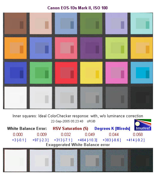 This image shows how the 1Ds Mark II actually rendered the colors of the MacBeth chart, compared to the numerically ideal treatment. In each color swatch, the outer perimeter shows the color as actually captured by the camera, the inner square shows the color after correcting for the luminance of the photographed chart (as determined by a 2nd-order curve fit to the values of the gray swatches), and the small rectangle inside the inner square shows what the color should actually be, based on perfect rendering to the sRGB color space. The camera overexposed the target by a third of a stop or so, so all the swatches are lighter than their ideal values, but the hue and saturation visual variances are in line with the numeric results shown above.