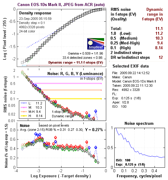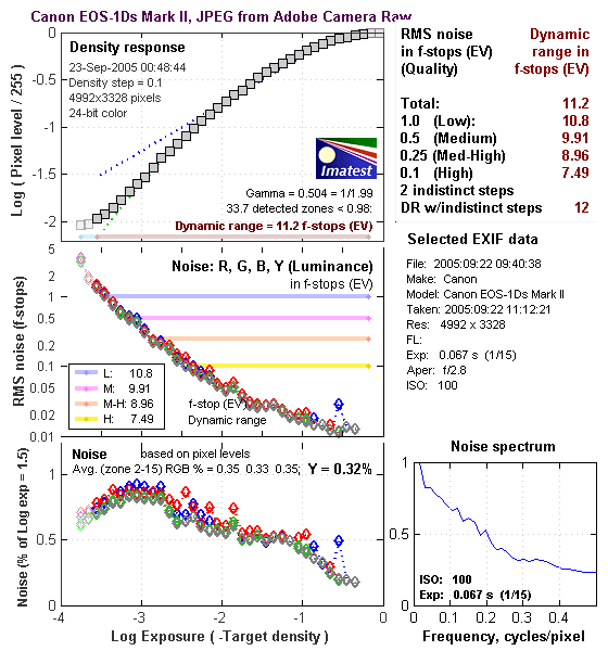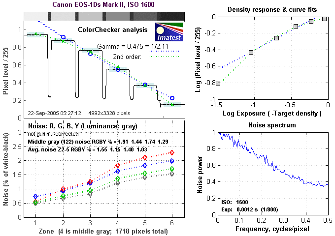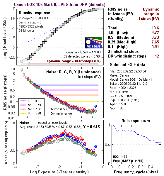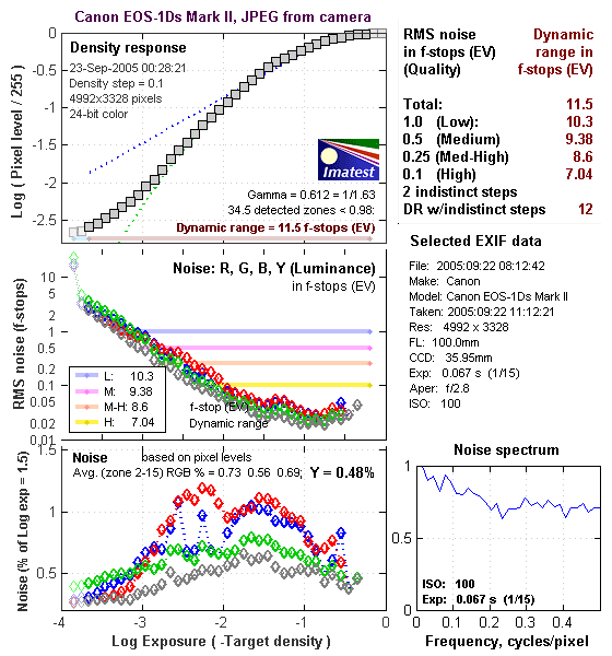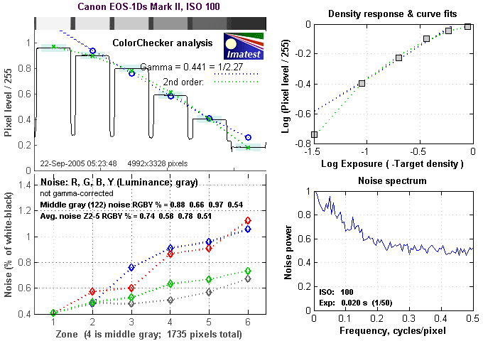 There's a lot in this particular graph, a lot more than I have room to go into here. Bottom line, the 1Ds Mark II's noise levels are very low. If you compare these graphs with those from other competing cameras though, what will stand out the most is the shape of the Noise Spectrum curve in the lower right corner - The 1Ds Mark II's noise is unusually fine-grained, which shows up in the Noise Spectrum plot as the very flat profile at frequencies of 0.2 cycles/pixel and greater.