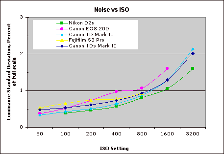 This chart compares the 1Ds Mark II's noise performance over a range of ISOs against that of other cameras. While I continue to show noise plots of this sort because readers ask for them, I have to again point out that the noise magnitude is only a small part of the story, the grain pattern being much more important. The bottom line really comes when you look at prints from 1Ds Mark II images shot at ISO 1600: We were very impressed by how smooth they looked, with only a slight softening of details betraying the operation of the camera's anti-noise processing. (Prints from ISO 1600 shots as large as 13 x 19 inches really looked surprisingly good.)