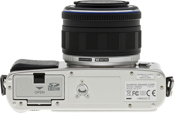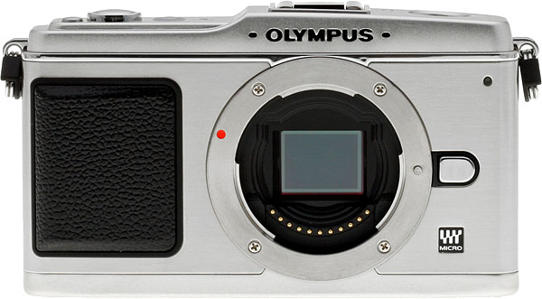 Front View. The Olympus E-P1 has a very clean, retro looking front, with minimal controls. The grip bevels down as it approaches the lens, and gives a little when you press on it. It's nice to use a metal camera again. Those dots left and right of the logo are holes for the stereo microphones.