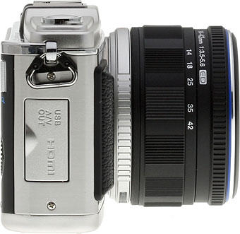 Right View. The right side of the camera contains access to the USB/AV and HDMI ports. (Shown with M.Zuiko Digital Micro Four Thirds 14-42mm f/3.5-5.6 ED lens in retracted position.)