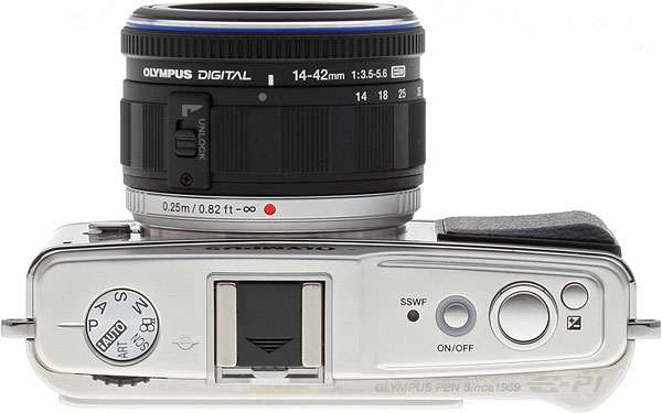 Top View. The top panel has a few controls including the Mode dial (activated from the rear), On/Off switch, Shutter button, and Exposure Compensation button. A hot shoe is provided for flash or the optional optical viewfinder (it's included with the 17mm kit).