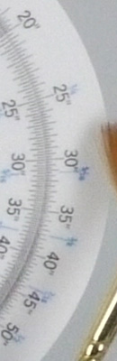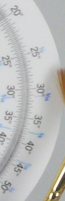 The above crops show the effects of the Olympus E-P1's four levels of noise reduction available, under the studio HMI lighting we use to simulate daylight. To our eyes, the default level of noise reduction strikes a good balance between noise and subtle subject detail, although the red fabric swatch presents a real challenge, as it does for virtually all cameras we test. Cranking the noise reduction setting up to High produces very smooth-looking images, while still maintaining good detail in areas of high local contrast (as seen in the circular scale), but a lot of detail is lost in areas of subtle contrast (the red fabric swatch is a particularly challenging subject, and the detail loss there is worse than you'd find in most real-world examples). At the other end of the scale, the Off noise reduction setting leaves a lot of noise in the image, but also leaves the subject detail largely undisturbed: Use this setting if you have good third-party noise reduction software; with appropriate processing, the result could be quite good. You should be able to do even better working from the RAW files.