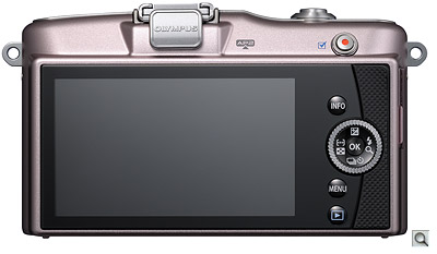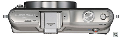 Viewfinder. The Olympus E-PM1 includes a small accessory port just beneath and behind its flash hot shoe, a design first seen in the preceding E-P2 model which allows the camera to accept a number of accessories, including the VF-2 electronic viewfinder. We've described this device in past reviews, and it's rather a nice design. A little bulky perhaps, and its use prevents an accessory flash strobe being mounted, but it has high SVGA resolution, a 100% field of view, 1.15x magnification, and a tilt mechanism allowing viewing from overhead.