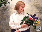 - Color: Red skin tones, dark colors in bouquet.