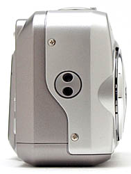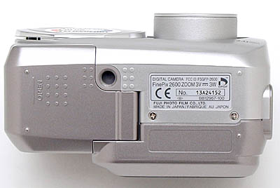 The 2600 Zoom's bottom panel is fairly flat, though a series of raised bumps provide traction for the SmartMedia / battery compartment cover, and level out the area surrounding the tripod mount. A sliding cover protects the SmartMedia / battery compartment, and slides outward (toward the back of the camera) before opening on a hinge to reveal the compartment. This is a great design for maximizing the camera's space, but bad for tripod work as you have to dismount from the tripod to change batteries or change out the memory card. We suspect this won't be much of an issue for users of this camera however, as its designers were clearly intending it for on-the-go use, not studio shooting. The tripod mount features plastic threads and is a bit off center from the lens. The mount is fairly close to the center of the camera body though, and it remained stable on our tripod while we were shooting with it.