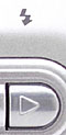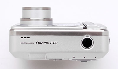 With the lens retracted, the F410's front panel is nearly smooth, with just a small protrusion around the outside ring of the lens barrel and a slight bump on the left side (as viewed from the front) for the combined finger grip / power switch. A protective lens cover automatically slides open when the camera is powered on, letting the lens telescope outward, thereby eliminating the need for a lens cap. The entire handgrip bulge on the left side (as viewed from the front) serves as a power switch, sliding open to power the camera on. The three blue LED lamps illuminate briefly when the camera is turned on, the center LED lamp also acting as the Self-Timer LED, blinking to count down the self-timer interval. The sculpted power switch also serves as a finger grip when holding the camera in shooting position. Also on the front panel are the flash, optical viewfinder window, and flash exposure sensor.