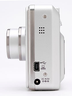 On the left side of the F410 is the camera's speaker, as well as the USB and DC-In jacks.