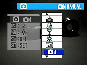 Scene Position: Selects from the available Scene modes: Portrait, Landscape, Sport, Night, Beach & Snow, Sunset, Museum, Party, Flower Close-Up, Text, and Manual - Exposure Compensation: Allows for +/- 2.0EV of exposure compensation from the metered exposure, in steps of 1/3EV.