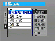 Language: Sets the menu language to English, French, German, Spanish, Italian, Chinese, or Japanese.. - USB Mode: Sets the USB mode to PictBridge (Direct Printing) or DSC (Storage device).