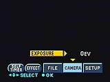 - Camera: pulls up the exposure compensation setting which is adjustable from 1.5 to +1.5 in 0.5 EV increments.