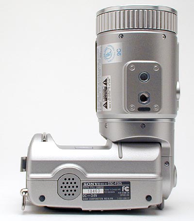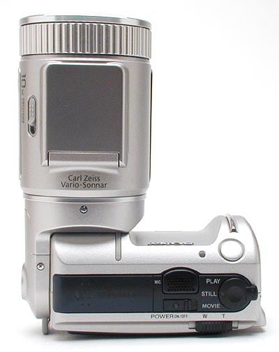 First of all, what a completely unique design! It really makes the DSC-F505 an eye-catcher (as we noticed in our field tests: "What IS that thing?"). The rotating lens definitely tops our list for flexibility and innovation with its nearly 180 degree rotation. The large lens dominates the design, and leads to a very different way of holding the camera, but we very quickly became used to this. The large lens barrel actually makes for very stable camera support, encouraging a two-handed grip, and providing good support around the unit's center of gravity. Because the tripod mount is actually located on the bottom of the lens, you can tilt the body of the camera up for easier reading of the LCD monitor (no more leaning over). Not to mention the fact that the lens flexibility gives you more shooting options as you can point the lens straight up or nearly straight down, while still viewing the LCD in a normal orientation.