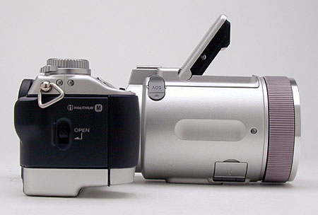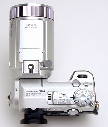 This year, Sony's obviously listened hard to feedback from the F707 users (and reviewers! ;-) and came out with an impressive update in the form of the F717. While basic specs are still the same (the same lens and CCD), the new model incorporates numerous improvements across the board. The user interface has been revamped, so the lens ring can now control both focus and zoom. (A subtle change that makes a noticeable difference in the camera's usability.) Autofocus speed has been markedly improved, as have color rendering and white balance performance. (The F717 now holds the title of the fastest-focusing (across its full zoom range) consumer digicams I've tested so far, as of 8/29/2002) The F717's autofocus system is also considerably more sophisticated than that in the F707, incorporating the 5-zone AF system first seen on this year's Mavica CD-400. I don't know to what extent my own harping on the issue may have contributed (this was an issue I'd really climbed on my soap box over with all the high-end Sony cameras), but Sony has now included a generic hot shoe flash connector on the F717, allowing users to couple generic auto flash units and studio strobes to the camera.