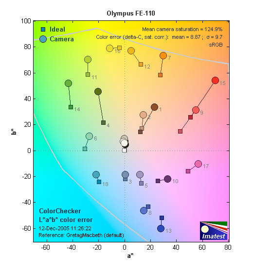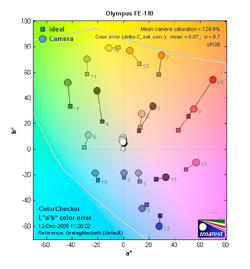 Most consumer digital cameras produce color that's more highly saturated (more intense) than found in the original subjects. This is simply because most people like their color a bit brighter than life. The Olympus FE-110 oversaturates color quite a bit, as you can see in the diagram at right. Warm colors appear to be the most affected, though the greens are also skewed.