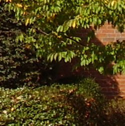 The Olympus FE-110's images are slightly soft overall, without only a little over-sharpening and edge enhancement noticeable in high-contrast areas. (Edge enhancement creates the illusion of sharpness by enhancing colors and tones right at the edge of a rapid transition in color or tone.) In the foliage above, details are well defined, but just a hint soft.