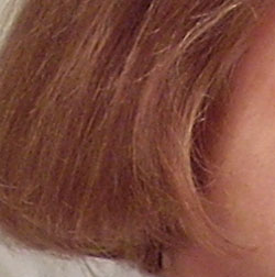 Noise-suppression systems in digital cameras tend to flatten-out detail in areas of subtle contrast. The effects can often be seen in shots of human hair, where the individual strands are lost and an almost "watercolor" look appears. The crop at far right shows this, with darker areas of Marti's hair showing only limited detail, even though individual strands are quite visible against the shadows by her cheek.