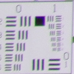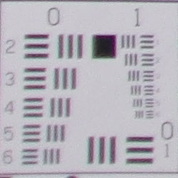 Chromatic aberration is moderate to high at wide angle, showing a good-sized fringe of coloration on either side of the target lines. At telephoto, the distortion is much stronger, with very wide areas of bright coloration that are easily visible in 8x10 inch prints. (This distortion is visible as a slight colored fringe around the objects at the edges of the field of view on the resolution target.) This effect is noticeable in many of the Casio EXILIM EX-FH20's images.