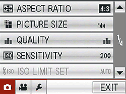 Normal Picture is comparable to Program AE in other cameras. In the Normal setting when you tap DISP (Display) in the lower right corner you get access to several parameters including exposure compensation, flash, macro and self-timer. A smaller Q Menu (Quick Menu) box appears on the left. Tap this and you can adjust still/video resolution, white balance, type of O.I.S., color mode, Intelligent Exposure and Intelligent Resolution. Surprisingly, ISO is not available in the Quick Menu which seems like a mistake since that's one setting you're likely to change fairly often. You will find it when press the Menu key along with other options such as Face Recognition on/off, AF mode and so on. There are absolutely no options for changing the aperture or shutter speed other than via Scene modes. If you want to make them, the Panasonic FX75 is not for you.