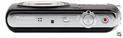 On the top of the Panasonic FX75 is a two-pinhole mic, a four-pinhole speaker, an on/off switch, and a shutter button surrounded by a zoom toggle control. At the far right is a dedicated video button with a red dot so you can immediately capture a movie, if that's your desire.
