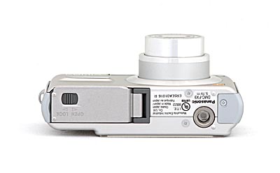 The Panasonic Lumix FX9's bottom panel is reasonably flat, with a spring-loaded door to access the SD/MMC memory card slot and battery compartment at the right of the camera, and a threaded plastic tripod mount near the left rear corner. The battery and card do not fall free when the door is opened, with the battery being held in place by a sliding lock. The tripod mount is positioned off-center from the lens, and is too close to the corner of the camera to provide a stable platform. The tripod mount should be far enough from the battery compartment to allow for quick battery changes (something I'm probably more sensitive to than most users, given the amount of on-tripod shooting I do).