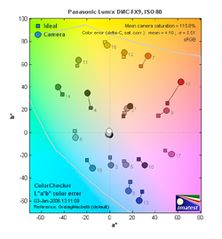 The other important part of color rendition is hue accuracy. Hue is "what color" the color is. The Lumix FX9 tended toward a warmer color cast in many instances, though results here should still be acceptable to most consumers.