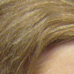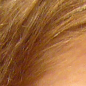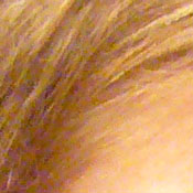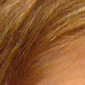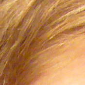 | Pretty good definition of high-contrast elements. | Subtle detail: Hair Noise suppression tends to blur detail in areas of subtle contrast, as in the darker parts of Marti's hair here. |