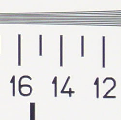 Our laboratory resolution chart revealed sharp, distinct line patterns down to about 1,200 lines per picture height, with extinction at around 1,650-1,700. (The camera produced slight color artifacts at lower line frequencies, visible in the full-sized res target shots.) Use these numbers to compare with other cameras of similar resolution, or use them to see just what higher resolution can mean in terms of potential detail. Beware that while you might be able to make out what looks like distinct lines at numbers higher than those we've mentioned here, the camera is just doing its best to continue interpreting the lines. If you zoom in and follow them from the wider portions, you'll see the lines converge and reappear several times, so the lines you see at 1,600 and higher are really only artifacts generated by the camera's imaging system.
