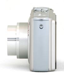 The right side of the Lumix FX9 (as viewed from the back) features only the Audio / Video port which doubles as the Digital Out port, and the DC In connector, both behind the same small plastic door. Above that is an eyelet for the wrist strap.