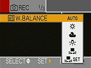 White Balance: Sets the white balance to Auto, Daylight, Cloudy, Halogen, Manual, or White Set modes. (White Set isn't a separate white balance mode, it's just the option for manually setting the white point that's selected by the Manual option.)