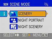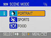 - Scene Modes: Scene mode choices are Portrait, Sports, Food, Scenery, Night Portrait, Night Scenery, Baby, Soft Skin, Candle Light, Party, Fireworks, Snow, Starry Sky, and Self-Portrait.