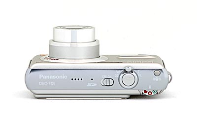 The front of the Panasonic FX9 naturally features the telescoping 3x Lumix DC Vario zoom lens. Above and to its right is the combination self-timer indicator and autofocus assist lamp. On the other side of the lens is the flash and below that on the left side of the front panel is a small sculpted grip.
