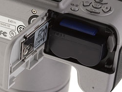 Bottom. An SLR-like lithium-ion battery powers the Panasonic FZ18, and SD cards provide storage.