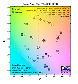 Saturation. The Canon G10 produced very good saturation overall, with only slight oversaturation in reds and blues. Some other colors such as bright yellows and purples were actually undersaturated a small amount. The Canon G10's images appeared to have natural looking color without appearing dull or subdued. Most consumer digital cameras produce color that's more highly saturated (more intense) than found in the original subjects. This is simply because most people like their color a bit brighter than life.