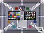 Our new "Multi Target" was first put into use in April, 2009, replacing the earlier "interim" design. This target incorporates a number of elements that combine aspects of the previous Multi target, as well as the previous Viewfinder Accuracy or "VFA" chart. Here's some of what you'll find in this target: Framing marks: This chart evolved from the earlier Viewfinder Accuracy chart, so one of its major uses is to measure viewfinder accuracy. (See notes in the Viewfinder Accuracy section, at the bottom of this page, for more information on this.) USAF resolution targets: An important use of this target is in evaluating lens quality, looking how well sharpness holds up as you move from the center to the corners of the frame. The little "USAF" resolution targets arranged at the center, in the corners, and along the diagonals are very useful for making fine judgements about blur, flare and aberrations in the image. We generally show crops of a USAF chip from a corner of the target and from the center, to show how lenses hold sharpness at wide and telephoto focal lengths. Alignment "bullseyes:" We find these graphics from the graphic arts world (used to align sheets of film in the old film-based prepress days) very useful for seeing chromatic aberration in lenses. The bold black/white elements are good for seeing the colored fringes caused by CA in the corners of the frame. MacBeth ColorChecker Chart: This is about as common a color standard as you can get these days, very widely available for only mildly exorbitant cost, and quite well controlled in its production. It thus serves as a good basis of comparison between cameras and between test setups. Imatest also understands the MacBeth colors very well, and uses them to produce its color accuracy map that we feature in all our reviews. MacBeth ColorChecker SG Chart: The ColorChecker SG chart provides a wider range of colors, to give a more detailed map of a camera's color handling. We haven't begun using this chart in the color-accuracy graphs we routinely offer, but expect to do so at some point in the future. In the meantime, we sometimes refer to this chart internally, to get a more complete idea of what a camera's color map looks like. Log C/F Target: The progressive resolution pattern located just below the center of the target is a Log C/F (logarithmic contrast vs spatial frequency) chart. Digital camera noise reduction routines work by looking at levels of local contrast, flattening-out detail at progressively lower spatial frequencies as the local contrast decreases. (This is very commonly seen in human hair, grass, foliage, and other subjects with subtly-contrasting fine detail.) This chart lets Imatest analyze just how a camera makes the tradeoff between contrast, detail, and image noise. Color Starbursts: The six circular starburst elements arranged around the target are intended to reveal de-mosaicing artifacts and color-dependent resolution issues. The six starbursts provide examples of each combination of RGB colors intersecting each other. (That is, red, green, and blue against black, plus red against green, green against blue, and blue against red.) Given that the most common sensor RGB color filter pattern (the so-called Bayer) pattern has twice as many green pixels as red or blue, you'll generally see that the green/black starburst shows the best resolution, while the blue/red one shows the worst. The effects of different sensor geometries and color filter array patterns will be revealed here. Musicians Image: Synthetic test patterns only tell you so much. While we have a lot of pictorial images in our other test targets, we thought it would be useful to include a small "natural" image here as well.