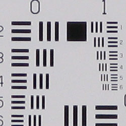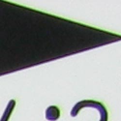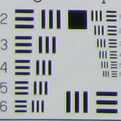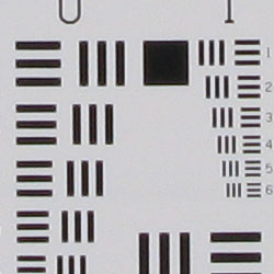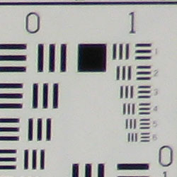 Chromatic aberration is fairly high at wide angle, showing about 10-12 pixels of bright coloration on either side of the target lines, and it extends fairly far into the frame. At telephoto, the effect isn't quite as strong, and pixels not nearly as bright. (This distortion is visible as a slight colored fringe around the objects at the edges of the field of view on the resolution target.)