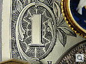 Macro: The Sony Cyber-shot DSC-H20's Macro mode captures a sharp image at the center, with some softness in the corners and noticeable chromatic aberration around the printed details of the dollar bill. Minimum coverage area is 1.19 x 0.90 inches (30 x 23 mm). The camera focuses so closely that the flash is blocked by the long lens at the most extreme closeup, resulting in an uneven exposure. Thus, you'll want to stick with external lighting for your closest macro shots.