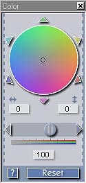 Once the exposure range is set, it's time to consider the color balance of your image. Overall color is manipulated by the control panel shown at right. Here, the cursor in the color wheel (shown in the neutral, centered position) is used to shift the overall color balance of the image in the direction of whatever color it's dragged toward. For example, dragging it toward green shifts the balance toward green and away from magenta. This is a very intuitive way to adjust color balance, but we felt that the control produced rather large variations for relatively small movements: We'd like to see a "sensitivity" adjustment somewhere to affect how strongly this control affects the image.