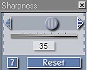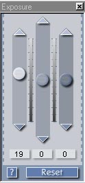 As mentioned above, the Exposure control (shown at right) is the first tool you should use in adjusting a problematic image. The reason for this is that adjustments in the exposure, (tonal range), of an image can significantly affect the color balance, by changing the "saturation" or intensity of colors. In addition to the ubiquitous "reset to defaults" and "help" buttons, the three slider controls here adjust "midtones" (actually, overall exposure), highlights, and shadows separately. The manual advises to make adjustments with the "midtones" slider first, as it affects highlights and shadows as well. We found this to be good advice indeed, as the effect of the midtone slider was pretty profound, dramatically affecting the overall exposure. The highlight and shadow sliders on the other hand, are fairly limited in the range of tonal values they affect. That is, the highlight slider only affects very light portions the image, and the shadow slider only affects very dark areas. In practice, we found that making extreme adjustments with the highlight/shadow sliders could result in noticeable "tone breaks," where the effect of the slider abruptly cut off as the tonal values in the original image passed beyond the range of the control.