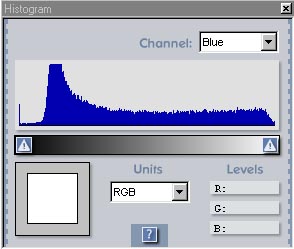 In some of our other reviews, we've made a big point of the usefulness of histogram displays for adjusting tonal values in scans and other digital images. The concept of a histogram (see the screen shot at right) is quite simple, but may take a little getting used to upon first contact. Histograms are just graphical representations of the distribution of brightness values in an image: There are 255 graph "bins", running from 0 at the left to 255 at the right. To build the graph, the computer counts the number of image pixels having each individual brightness value, and plots the totals. Thus, peaks in the histogram correspond to large areas of similar tone or color, while areas where the graph is close to zero mean that little of the image contains corresponding brightness values. (This happens most often in either the extreme highlights, at the right-hand side of the graph, or in the extreme shadows, at the left-hand edge of it.) So what's the use of this? Well, first of all, it can very quickly tell you if your exposure is high or low overall: The screen shot at right is from an image that was a bit bright overall, with no really dark shadows. Thus, the "dark" end of the histogram has almost no data present in it. This is a clue to bring down either the midtone or shadow sliders. Since the curve is fairly even overall, the indicated action in this case would be to pull down the "shadow" slider.