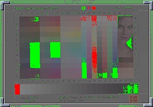 In the previous shot of the histogram window, you may have noticed the exclamation points at the two ends of the curve. These are buttons that activate the display shown in the screen shot above. Pressing the left-hand button highlights in green portions of the image that have been pushed all the way to "black" (0). Likewise, the right-hand exclamation-point button highlights in red all the parts of the image that have been pushed all the way to "white" (255). Used in conjunction with the exposure controls, these indicators are tremendously useful! Ideally, you'd want a sprinkling of both red and green indicators in your image, meaning that the lightest portions are just barely going all the way to "white", and the darkest portions just barely going all the way to "black." (The amount of red and green showing in the image above suggests it is perhaps pushed a bit too far at both ends of the scale.)