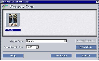 In addition to the HP Photo Scanning Software, the S20 package includes Microsoft PictureIt! for manipulating images, and the S20xi software package includes Broderbund PrintShop Organizer. We were disappointed to discover that the new S20 didn't ship with HP's excellent "Photofinishing" software for handling image output. According to a reader, this package is available for download on HP's PhotoSmart website. Follow this link to find the package. The current version on the HP site apparently is intended only for the C20/30 camera, and complains when the camera isn't attached, but our source indicates that it will work with images from the PhotoSmart Scanner as well. (We won't review this package here, since it isn't included with the S20, but we refer readers back to our review of the previous model of the PhotoSmart Scanner, for a fairly in-depth discussion of the Photofinishing application. Note that we also haven't tested this latest version with our eval unit of the S20 Scanner either.)
