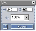 Cropping is set in the main Image Adjustments screen (shown earlier), by grabbing the corners of the "frame" around the preview image and dragging them until the desired portion of the subject is showing. Once this is done, the "Size" window (shown at right) will display the pixel dimensions of the selected area, based on the basic scanning resolution chosen in the initial Preview Scan window. You can make fine adjustments in the pixel dimensions, either by changing the value in the scaling percentage window, or by adjusting the horizontal or vertical pixel numbers accordingly. (Adjusting any one of these three values will adjust the others in concert, while leaving the image cropping as set previously.)