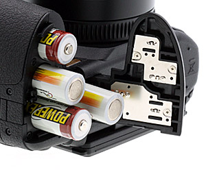 The Fujifilm HS10 is powered by four AA batteries which are inserted into the handgrip from the bottom of the camera. Using Alkaline batteries (the type supplied with the camera), the Fujifilm HS10 can capture approximately 300 frames, according to CIPA ratings. With NiMH rechargeable batteries, the HS10 can record 400 frames; and with lithium batteries it can record 700 frames.