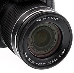 Zoom: The Fujifilm HS10's optical zoom offers a very impressive 30x optical zoom range, equivalent to 24-720mm on a 35mm camera. Performance at full wide-angle is pretty good for a wide superzoom, though with some blurring and coma distortion in the corners even at f/8, and moderate chromatic aberration near the edges of the frame. At full telephoto, performance is quite good in the center, and there's less chromatic aberration, but corners are somewhat soft. Still, an above average performance overall for a lens with such range.